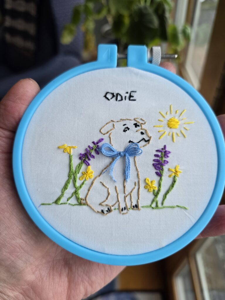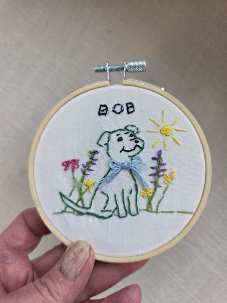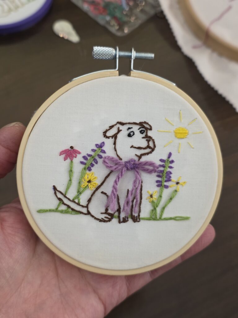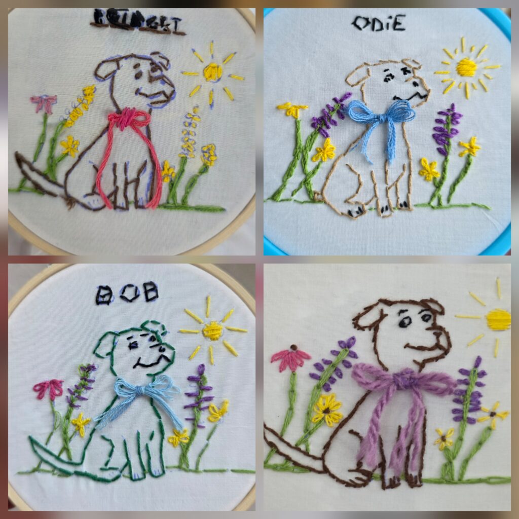 Four 9- to 12-year-olds — three girls and one boy — who took beginner embroidery classes from SOME EGA members Vicki J. Brown and Connie Small between December 2025 – January 2026 have completed their Floral Dog embroidery projects. Two of them have started second and third projects, and one pre-teen joined a local bimonthly stitching group in East Kingston.